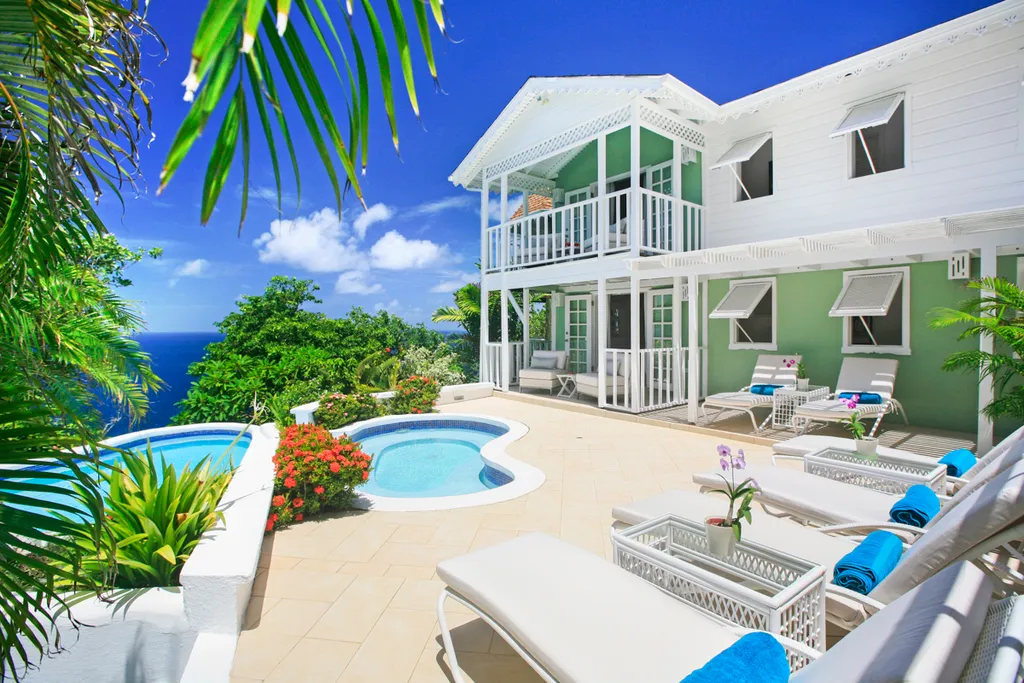 The villa has recently been extensively upgraded and refurbished; it now boasts three air-conditioned bedrooms each having en suite shower rooms. The Grand Master Bedroom (situated on the Ground Floor) has its own private balcony which has uninterrupted views to Martinique, a private furnished terrace which enjoys direct access to the pool area and views to the sanctuary of Pigeon Island. The Master Bedroom (on the upper level) has two private balconies, so that you can enjoy the sight of the crystal blue of the ocean and the exceptional views to Martinique and Pigeon Island.